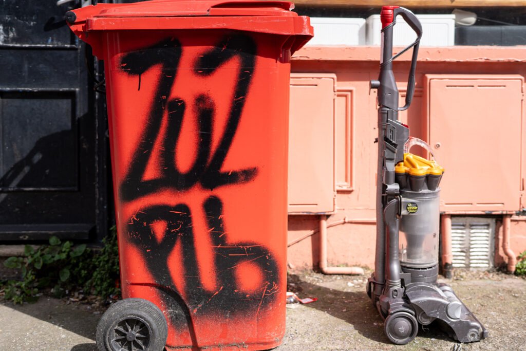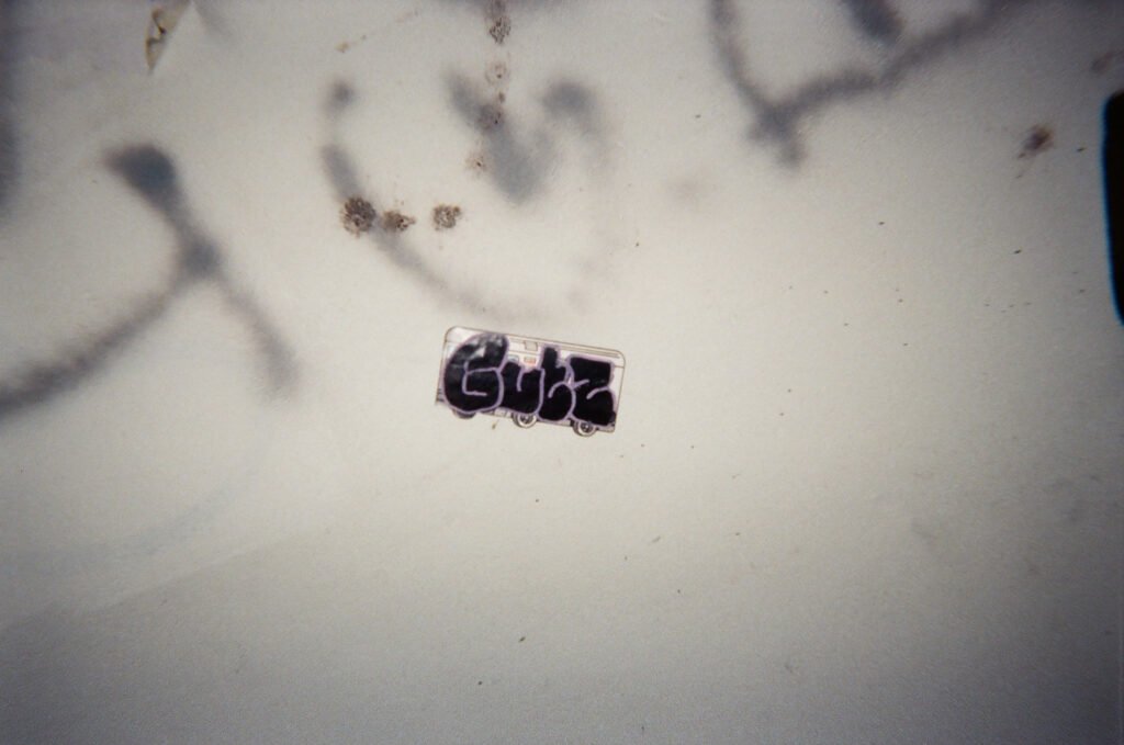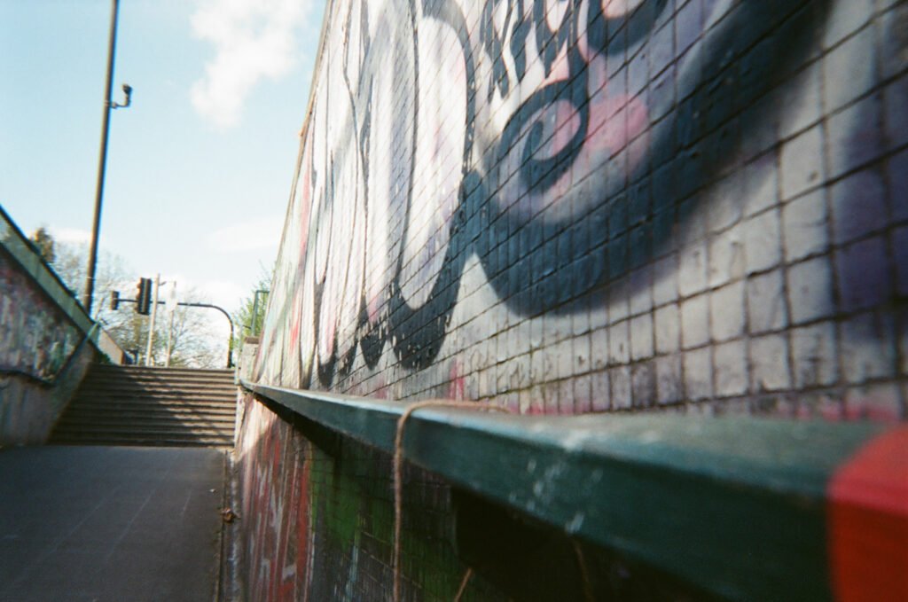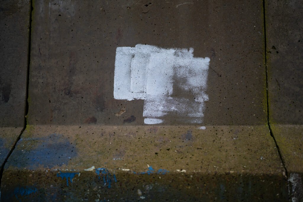 I decided to hang a ‘pop-up’ photography exhibition of images i had taken of the graffiti and found objects early on in the project. Finding somewhere to hang them was problematic. I devised a string system hanging down from the railings above beside an Underpass, put 12 A3+ images into plastic poly-pockets and attached them to the string by clips.
